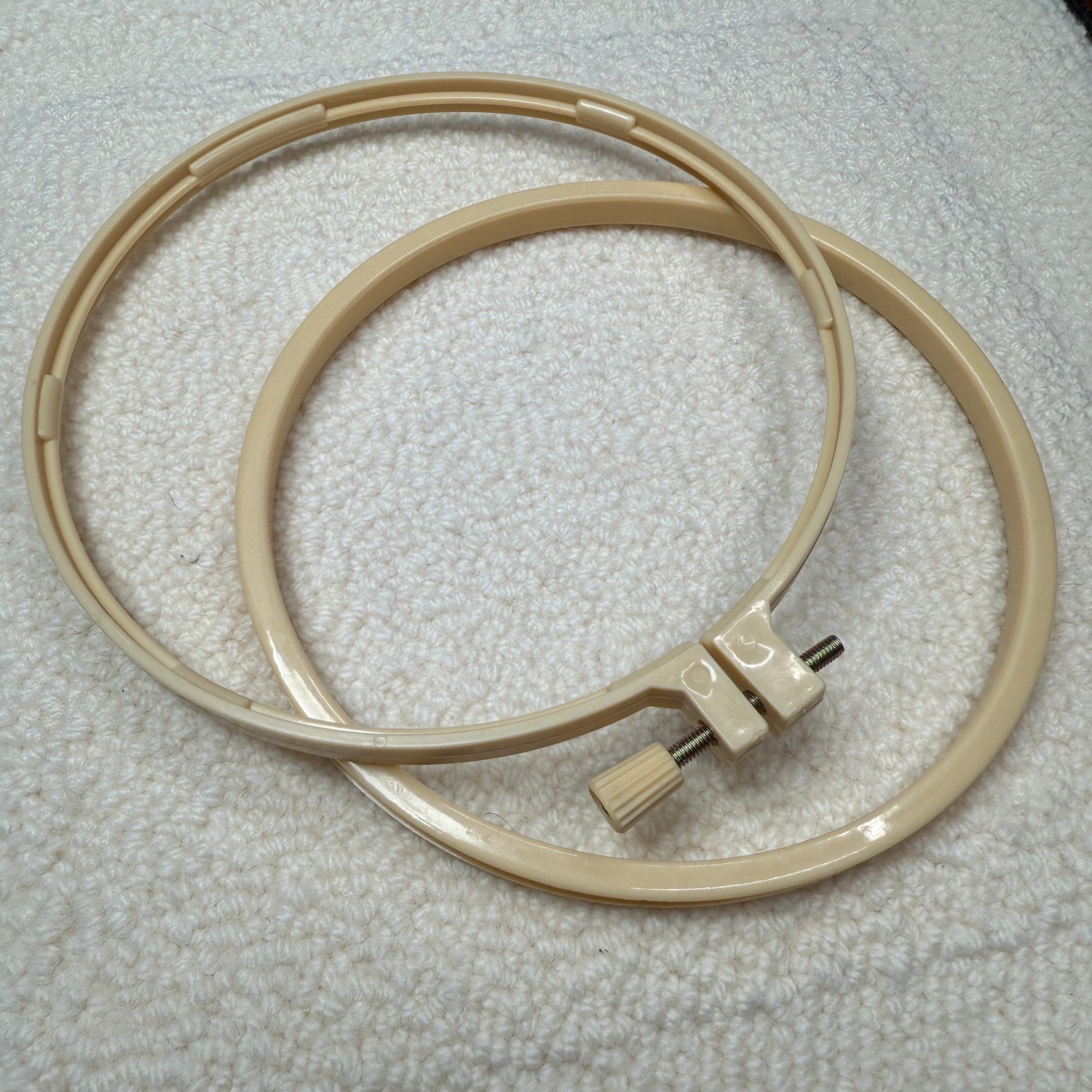 6-inch (15 cm) embroidery hoop with a securely fastened self tightening nut design within the hoop ring.