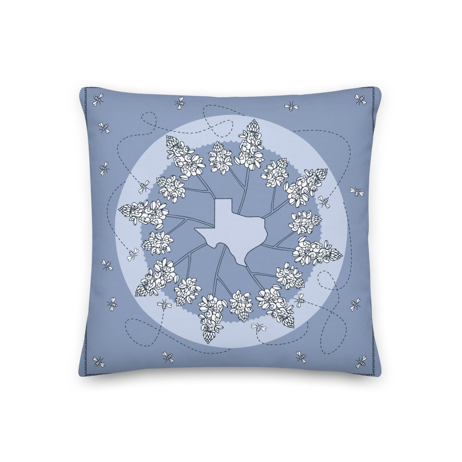 Bluebonnets and Bees Premium Pillow - Blue - 18″×18″ is backordered and will ship as soon as it is back in stock.