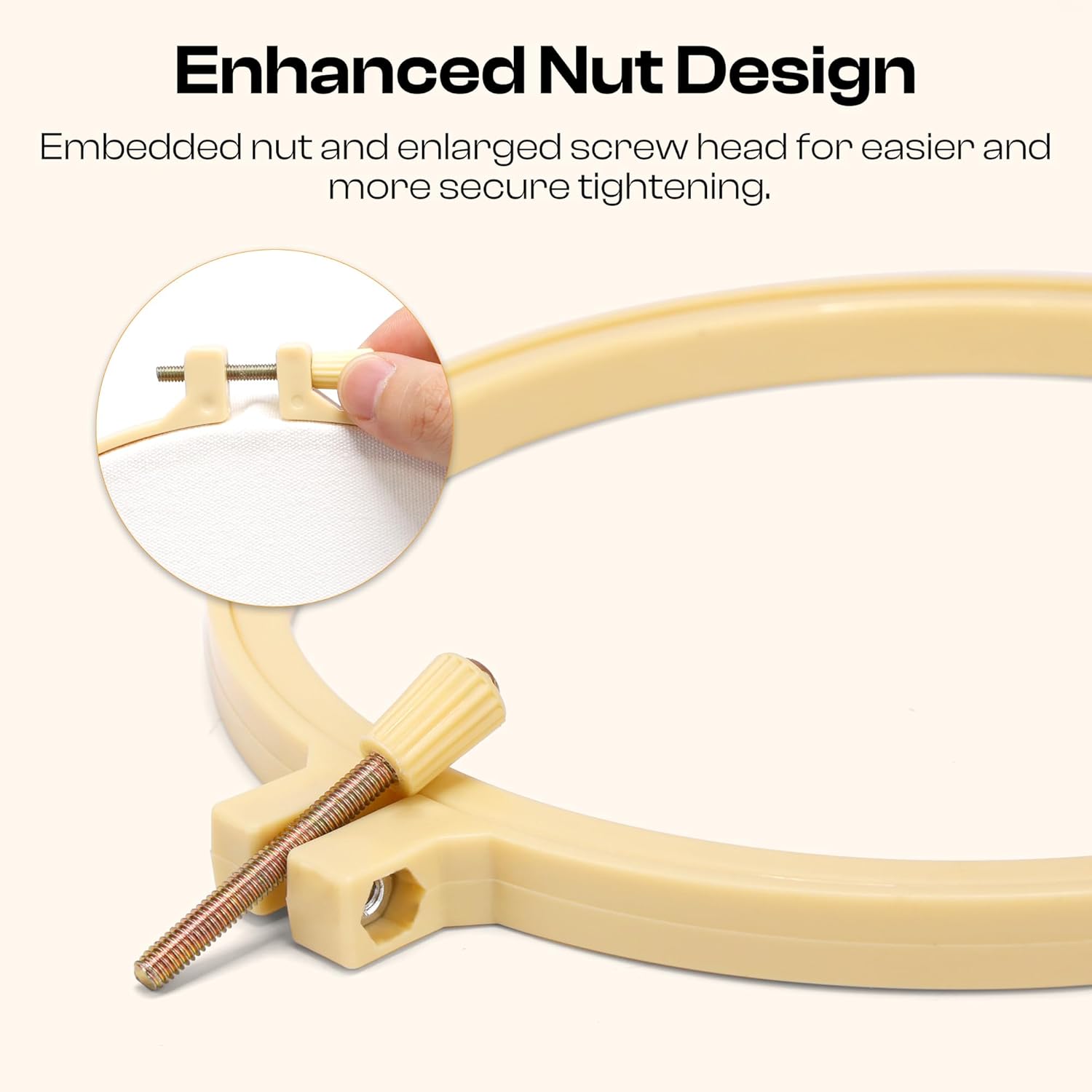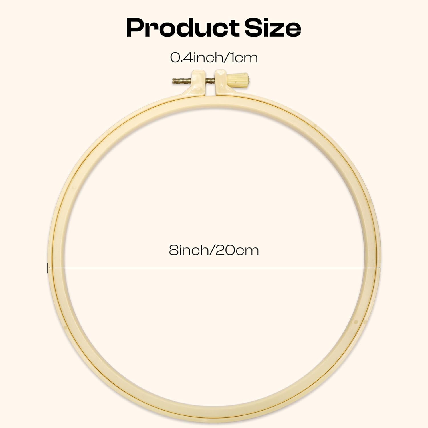 8inch/20 cm plastic no-slip single hoop with a securely fastened self tightening nut design within the hoop ring.