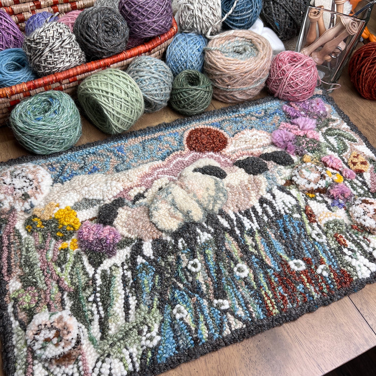 This rug / wall hanging was punched on monk’s cloth with multiple sizes of the Oxford Punch Needle. It is made with a technique called sculpting where multiple sizes of loops were punched and some loops were cut and sculpted to achieve a three dimensional artwork.